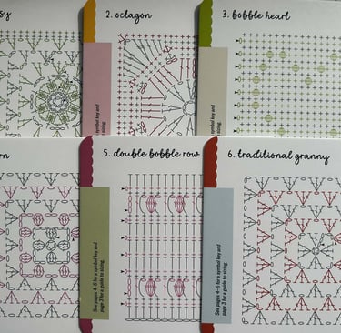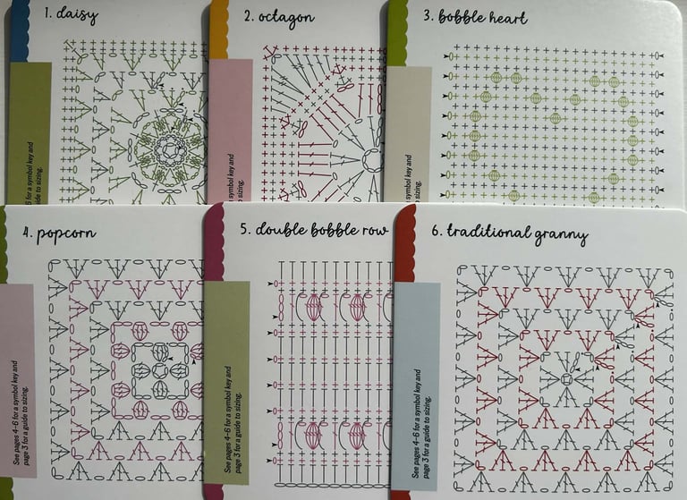 Inside the box, you’ll find 50 individual granny square designs, each presented on its own card. On the front, there’s a clear photograph of the finished square, and on the back, a crochet chart to guide you through the construction.