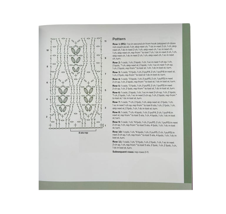 This one is worked from the centre out and like all the stitch patterns includes both a chart and the written instructions.