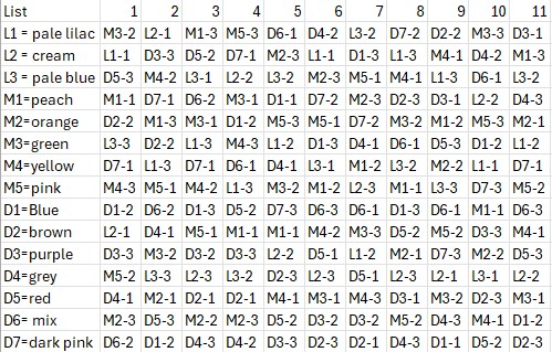 Below you can see how this works. I started with List 1, the first stripe is in M3 - peach and is 2 rounds tall, second stripe is in L1 - pale lilac and is 1 stripe tall, third stripe is in D5 - red and is 3 stripes tall.