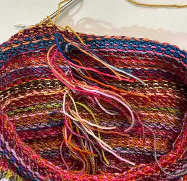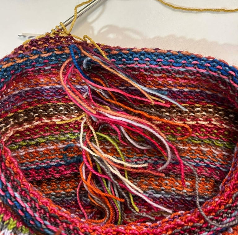 That one decision solved several problems at once: A scarf doesn’t need sweater quantities of yarn - colour play feels joyful rather than risky - and best of all… no ends to weave in — they can live happily on the inside and can even be knotted together as you can see below! 😱😱😱