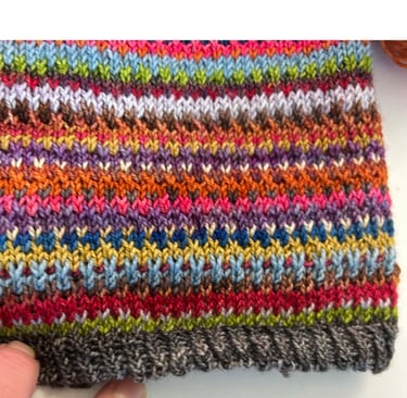 👉Decide if you want a border top and bottom. Just choose one colour and work either a 1 x 1 rib as I did for about 6 rounds or just knit 6 rounds in that colour and let the end roll over - both lovely effects.