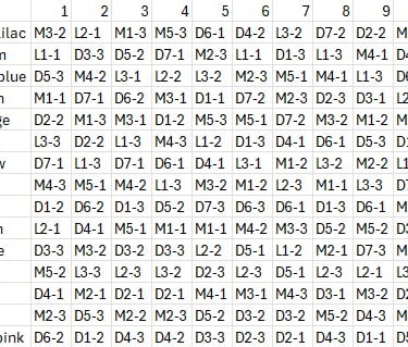 👉First of all decide on which colours you want to use. If you use 15 you can use my stripe charts above. If you have less just remove some colours from the list. If you have more just ask ChatGPT to do the same for you as it did for me!