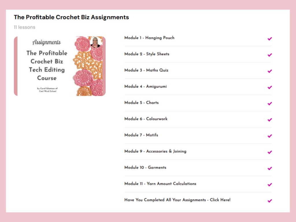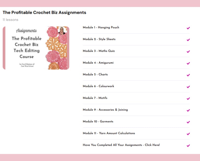 pattern types and styles to practise on. If you choose to take both the knitting and crochet tech editing courses together, you’ll work through a carefully curated sequence of assignments that do not duplicate each other, but instead build a fuller picture of how